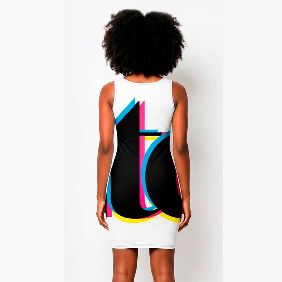 Tipografía CMYK expandida como gesto de energía y movimiento. El contraste blanco-negro equilibra pureza y fuerza, creando una silueta vibrante. Diseño envolvente que celebra la forma y la presencia: ser es suficiente. Una pieza que convierte el glitch en elegancia viva.